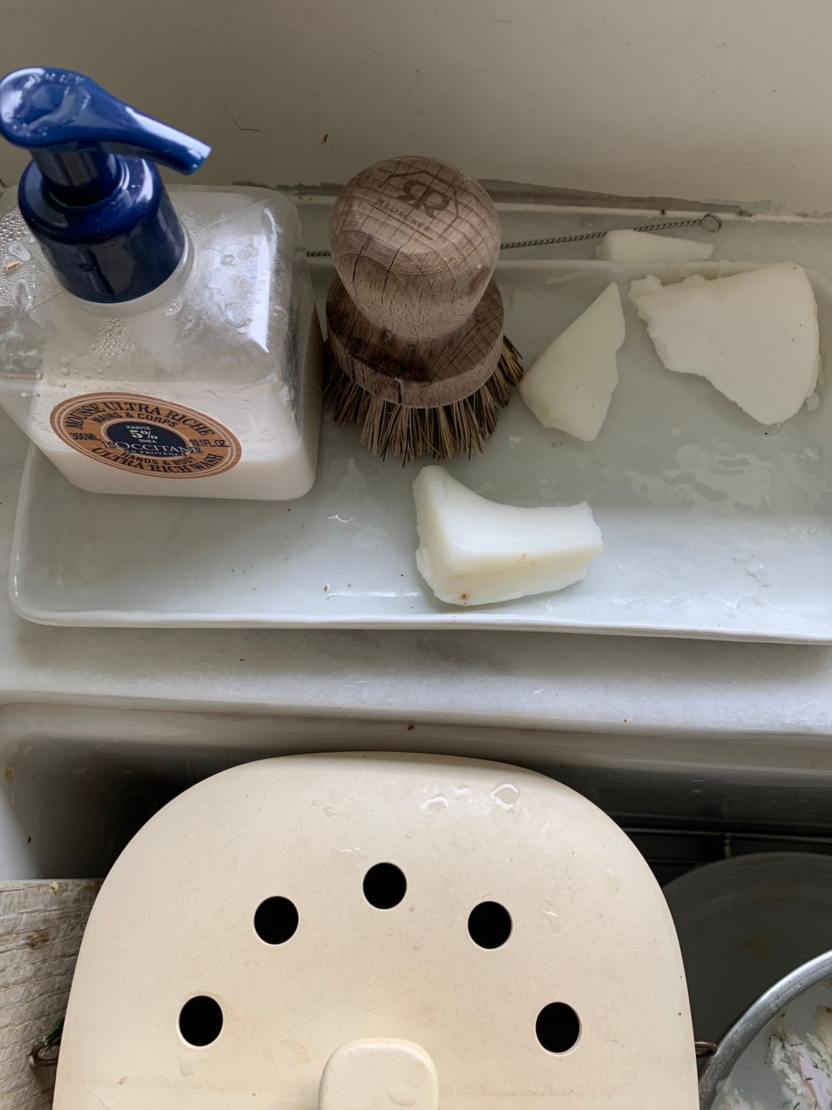 To use: Wet sponge or brush and rub dish soap bar to create suds. For pots and pans, use a scrubber or scourer.