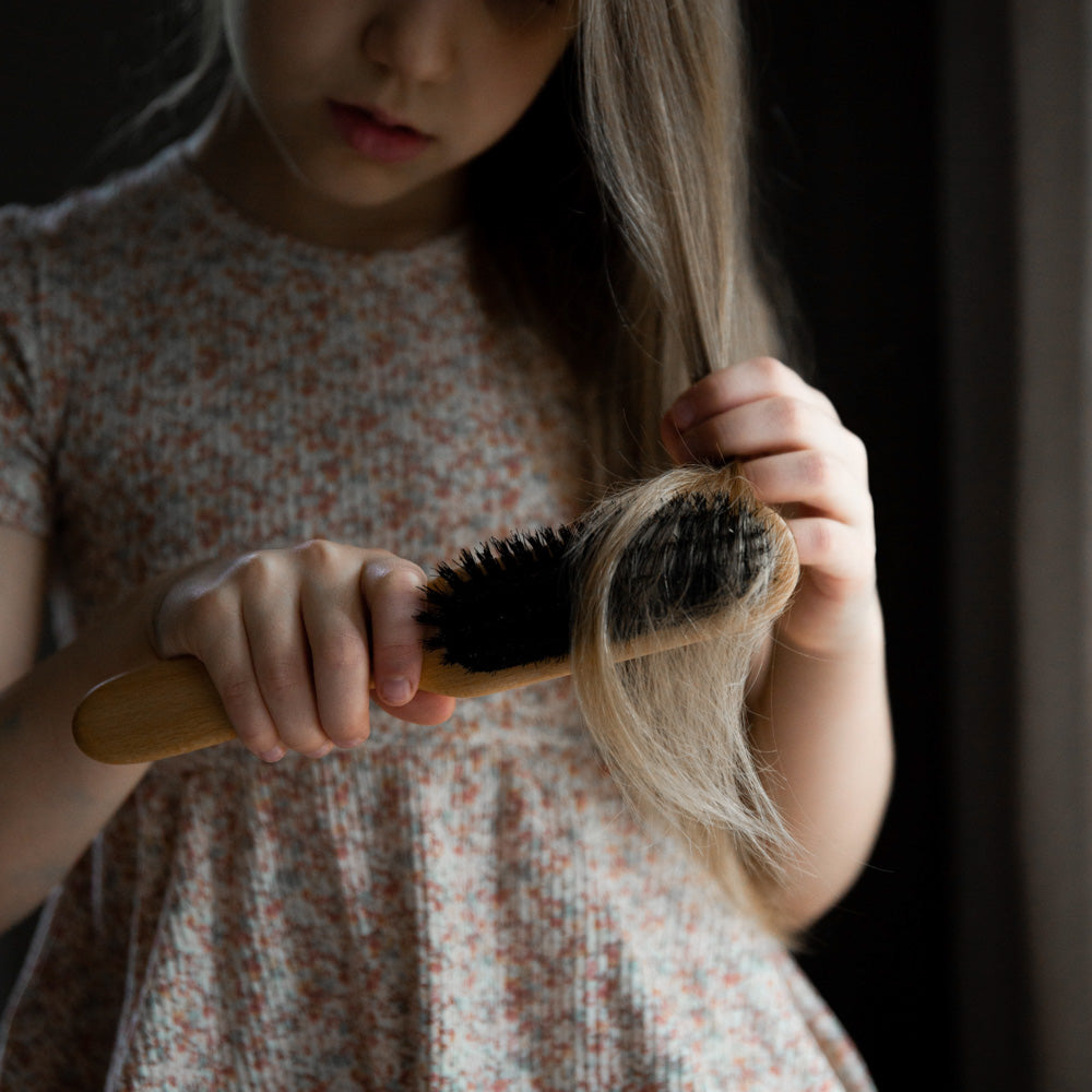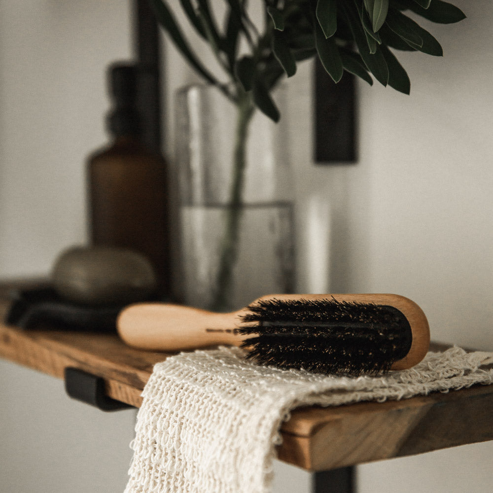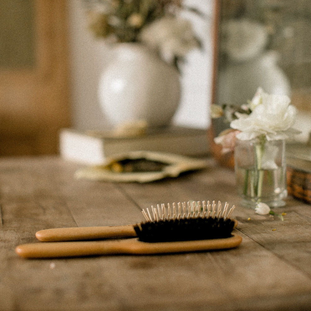 This natural fiber hair brush by Iris Hantverk detangles hair without pulling.