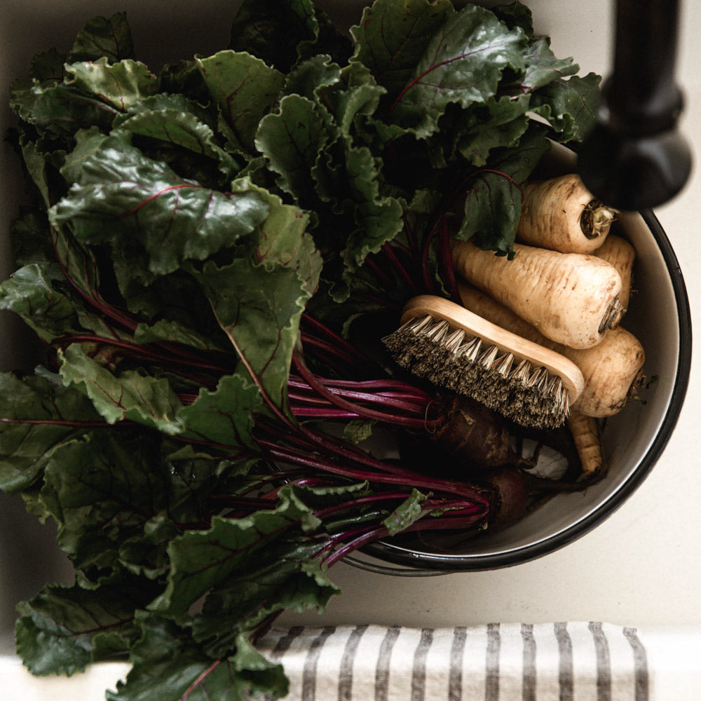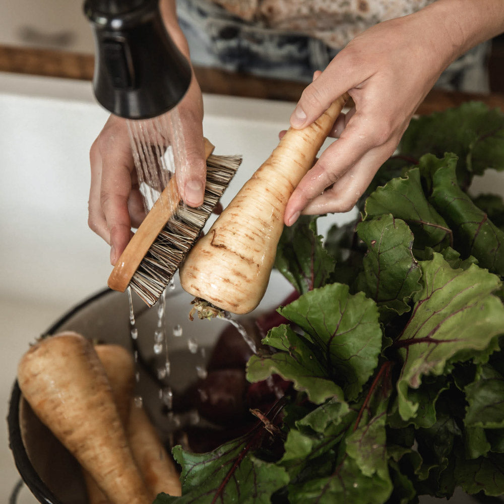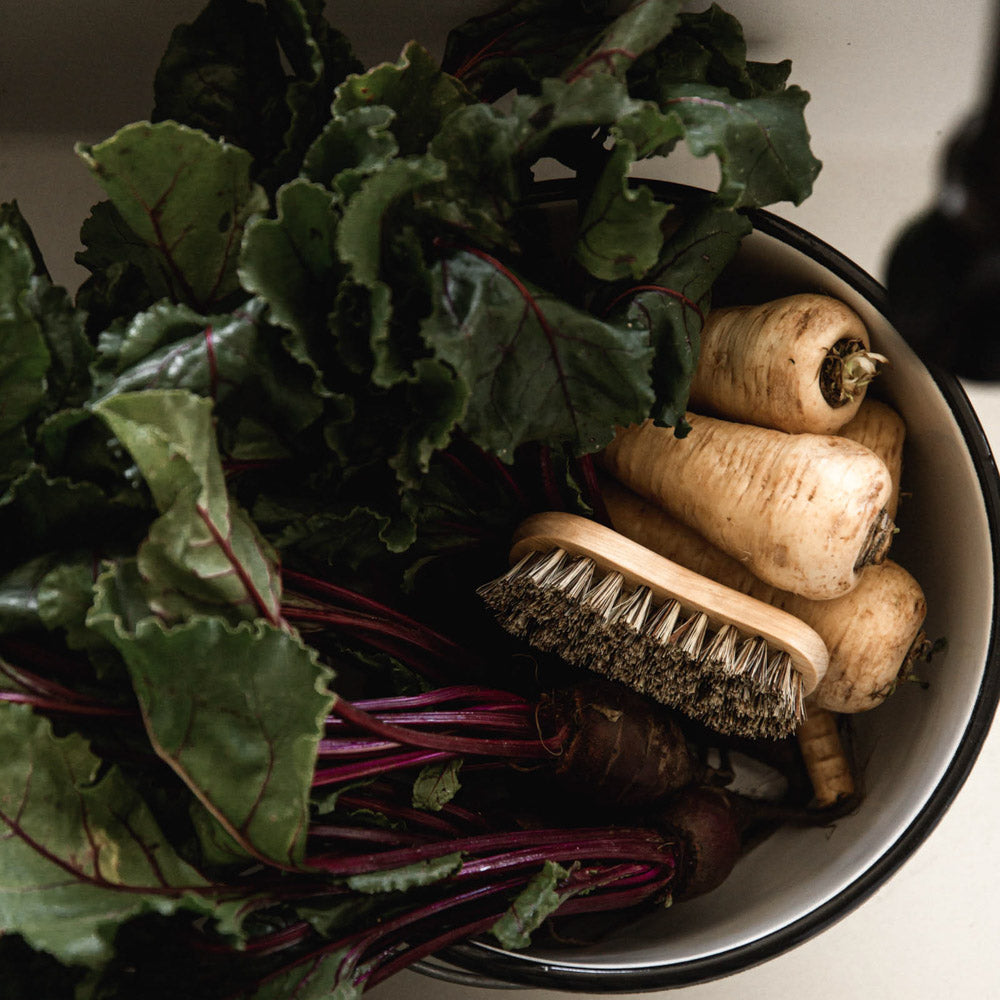 A hardy vegetable brush in birch and union mixture, perfect for for scrubbing potatoes and root vegetables.